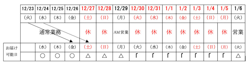 〇冬季休業期間前の最終のお届け日は、12月26日(金)の予定となります。